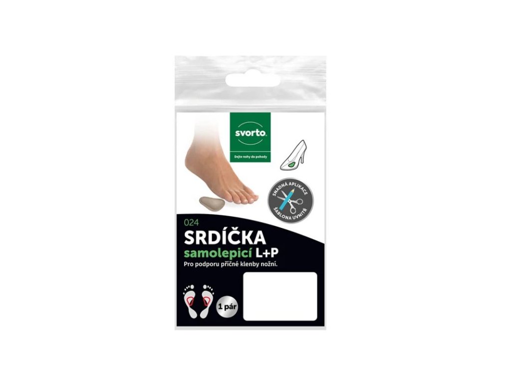 Anatomicky tvarovaná srdíčka pro levou a pravou nohu jsou vyrobena z měkkého latexového odlitku a určená k podpoře příčného plochonoží. Spodní strana je opatřena celoplošnou samolepicí fólií.