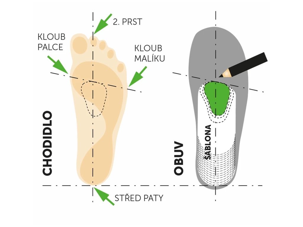 Vrchol srdíčka by měl ležet těsně za klouby záprstních kostí (metatarsů) na průsečíku podélné a příčné osy, nepatrně posunutý k zevní straně. Tento vrchol leží na podélné ose přibližně v 67 % délky krycí stélky obuvi (měřeno od paty). Směr průběhu srdíčka má odpovídat přirozenému tvaru nohy. Pro jednodušší aplikaci lze využít šablonu, která je na rubu příbalového letáku.