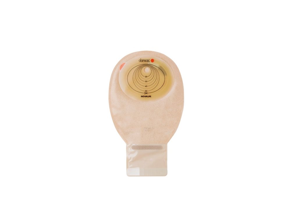 - Dansac NovaLife 1 Open je výpustný sáček s nízce střiženou oválnou lepicí plochou a otvorem v její horní části.