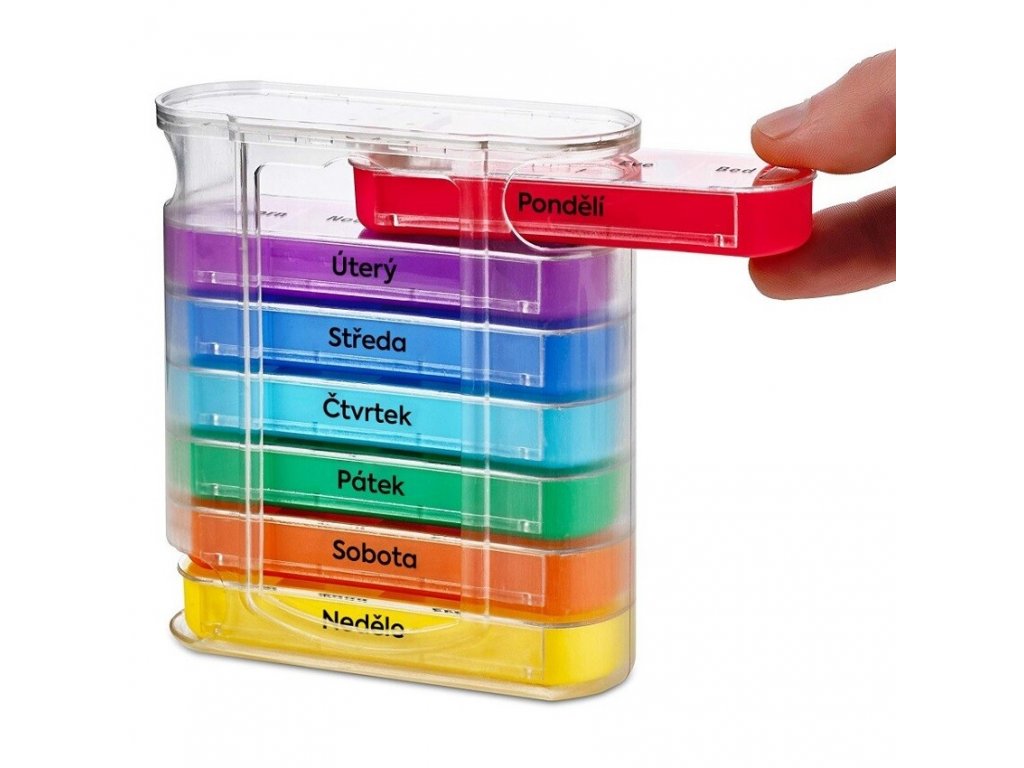 Týdenní dávkovač léků je praktický organizér na ukládání léků vybavený zásuvnými přihrádkami. s Patrové uspořádání zajišťuje ochranu léků před přímým slunečním světlem a šetří místo. Denní zásuvky jsou výrazně označeny dny v týdnu a dělené vždy na 4 části. Každá z těchto částí (ráno, poledne, večer, noc) je výrazně označena na víčku.