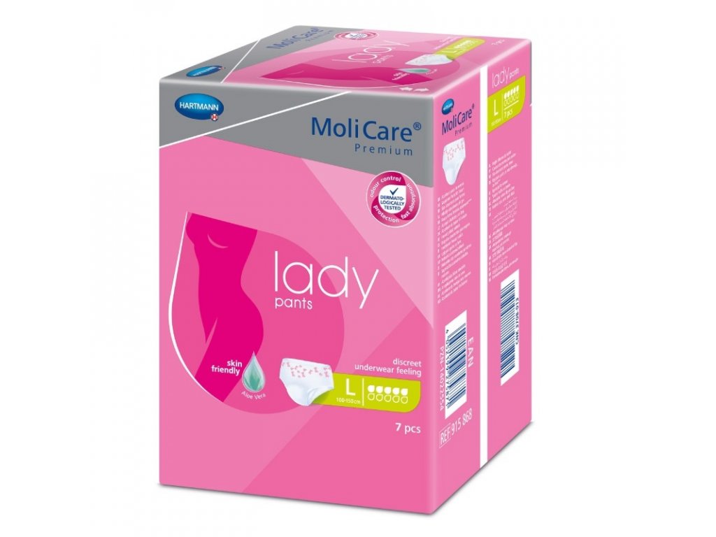 Dámské inkontinenční kalhotky MoliCare® Lady Pants pro střední až těžký únik moči vypadají jako klasické dámské kalhotky. Skvěle sedí, jsou maximálně diskrétní a motiv růžových motýlků podpoří vaši ženskost. Spolehlivě pohltí moč i zápach, obsahují výtažky z Aloe Vera, které pečují o intimní ženské partie, a optimální pH 5,5 vyhovuje i citlivé pokožce a pomáhá ji udržet zdravou.