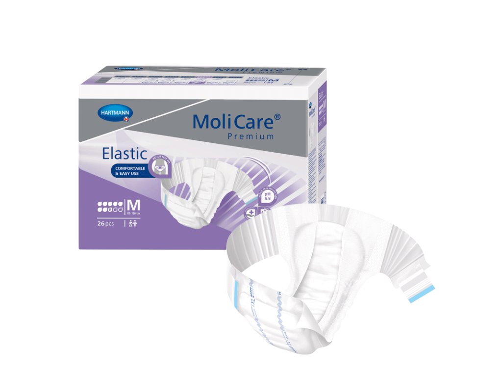 Unikátní zalepovací kalhotky MoliCare Elastic 8 kapek s elastickými bočními pásy pro usnadnění každodenní péče o osobu s těžkou inkontinencí.