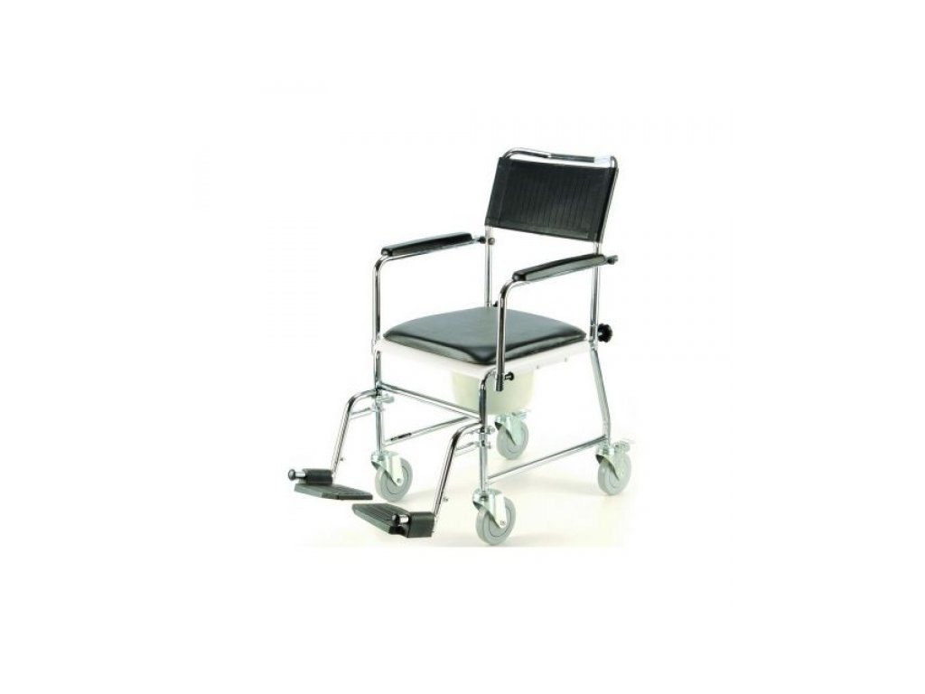 Kolové toaletní křeslo s odnímatelnými stupačkami, sklopnými měkčenými madly a ocelovým rámem. Kolečka jsou otočná, zadní mají brzdy. Plastové sedadlo s oválným otvorem pod kterým je plastová nádoba s víkem. Při nepoužívání je zakryto polstrovanou deskou. S křeslem lze najet i nad toaletu. Pro transport lze zádovou opěrku s postranicemi odejmout.