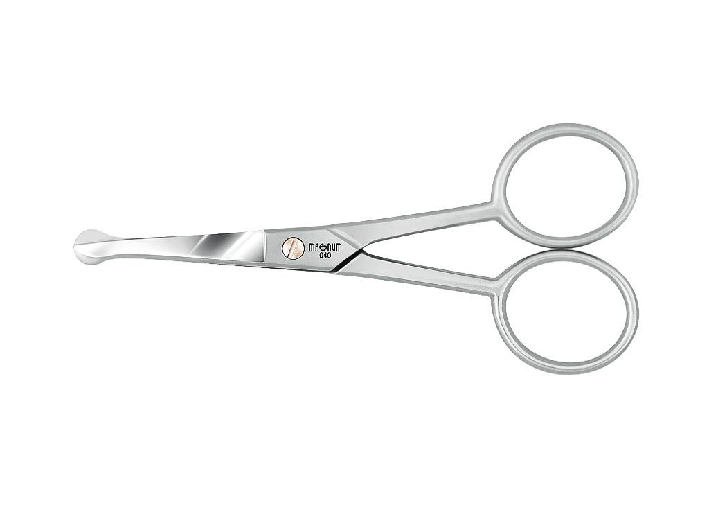 Profesionální bezpečnostní nůžky Magnum s kulatou špičkou pro šetrné odstranění chloupků z nosu, uší a oblasti vousů. Vyrobeny z nerezové oceli, vhodné pro kosmetické salony i náročné domácí použití.