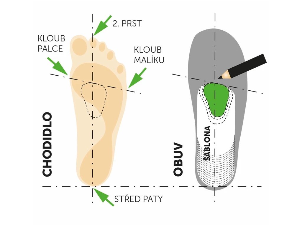 Vrchol srdíčka by měl ležet těsně za klouby záprstních kostí (metatarsů) na průsečíku podélné a příčné osy, nepatrně posunutý k zevní straně. Tento vrchol leží na podélné ose přibližně v 67 % délky krycí stélky obuvi (měřeno od paty). Směr průběhu srdíčka má odpovídat přirozenému tvaru nohy. Pro jednodušší aplikaci lze využít šablonu, která je na rubu příbalového letáku.