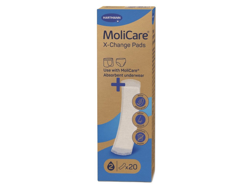 Inkontinenční vložky MoliCare X-Change jsou určeny k použití s absorpčním spodním prádlem MoliCare Lady a MEN pro lehký stupeň inkontinence. Tato vložka navýší savost dámského a pánského inkontinenčního prádla při lehkém úniku moči až o 100 ml a přináší extra ochranu a pocit sucha až po dobu 12 hodin. Mají vysoce absorpční jádro, které mění tekutinu na gel a neutralizuje nepříjemné pachy. Bez pleťových vod, parabenů, parfémů a latexu.