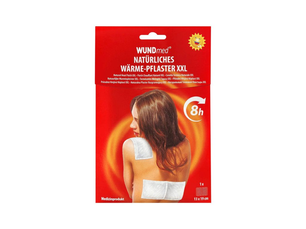 WUNDmed hřejivá náplast na bolavé záda a svaly - 13x19cm - 1Ks Hřejivá náplast WUNDmed je medicínským produktem s veškerou certifikací od německé tradiční značky. Přináší úlevu od bolestí svalů, zhuthlých kloubů a bolestí zad a to teplem. Přináší úlevu také u natažených šlach a podvrtnutých kloubů. Náplast funguje na principu tepelné terapie.Způsob použití: Před použitím roztrhněte obal náplasti. Z lepivé části odstraňte ochrannou fólii a přiložte náplast na bolestivé místo, přitlačte a uhlaďte. Hřejivé náplasti by neměly tvořit záhyby. Náplast začne působit po 30minutách od aplikace, kdy se zahřeje na terapeutickou teplotu. Maximální doba pro pužití náplasti je 8 hodin od její aplikace. Náplast je určena pro jednorázovou aplikaci.Složení: Výrobek obsahuje práškové železo, vodu, aktivní uhlí, sůl.Produkt má medicínskou certifikaci pro použití i v nemocničním provozu.Upozornění: Určeno pouze k zevnímu použití. Uchovávejte na bezpečném místě před dětmi. Skladujte v suchu a chladu. Při silném pocitu nebo nadměrném zarudnutí kůže náplast dále nepoužívejte. Hřejivé náplasti nejsou léčivými přípravky, proto nejsou náhradnou za léčiva předepsané lékařem. Hřejivé náplasti se nedoporučují v případech: na podrážděnou pokožku, odřenou, spálenou, pro těhotné ženy jsou hřejivé náplasty zakázané, po gynekologických operacích používejte náplasti až po úplném uzdravení, při cukrovce, při problémech s krevním tlakem, při srdečních a kardiovaskulárních potížích a nemocech konzultujte použití hřejivé náplasti s lékařem.