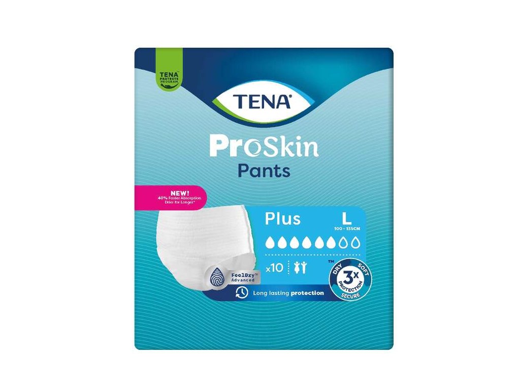 Plenkové kalhotky TENA Pants Plus jsou určeny pro střední až těžký stupeň inkontinence. Poskytují pocit bezpečí a lze je nosit stejným způsobem jako běžné spodní prádlo. Plenkové kalhotky jsou pohodlné, pružné a bezpečně obepínají boky. Lze je vyměňovat stejně snadno jako běžné spodní prádlo. Po použití lze plenkové kalhotky sejmout roztržením stran. Toto řešení umožňuje snadnou a dokonale čistou manipulaci.